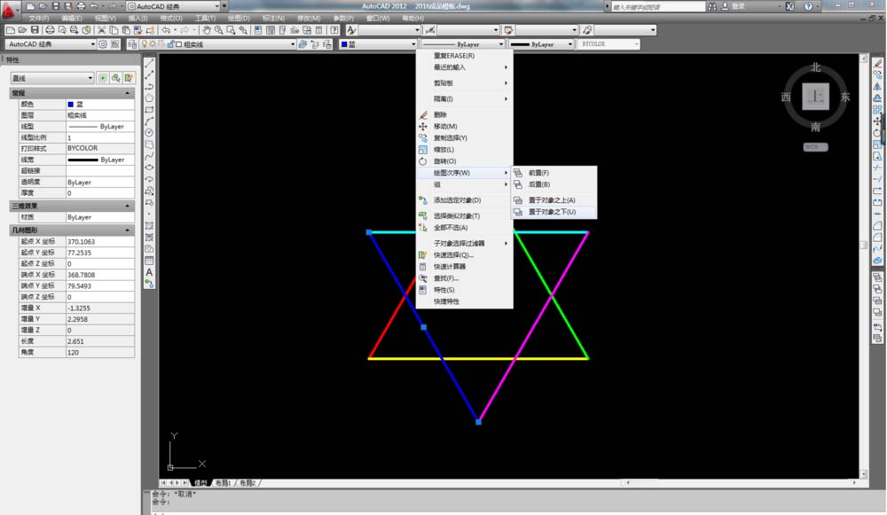 6、如下图所示,鼠标左键点击蓝色线段,然后单击鼠标右键,在弹出的下拉菜单中找到“绘图次序”,鼠标左键移到它的上面,继续出现下拉菜单,找到“置于对象之下”,左键点击它。