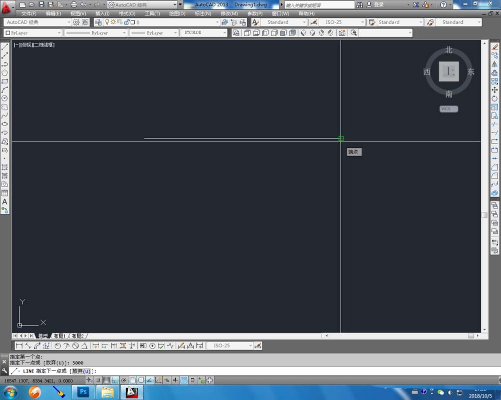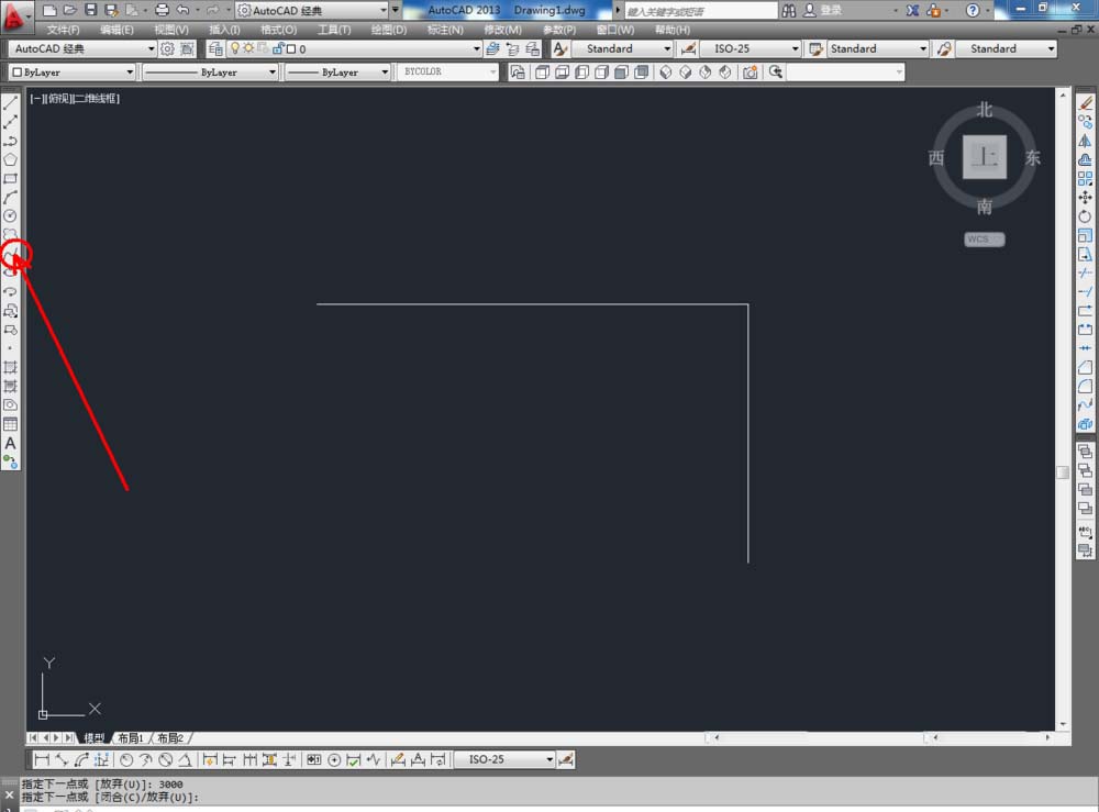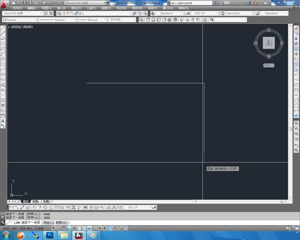 1、打开AutoCAD 2013软件,点击【直线】工具,在绘图区画出横向5m,纵向2m的两条直线;