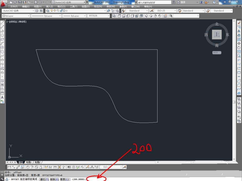3、点击【偏移】工具,输入数值:200+空格键,对三条线分别进行偏移复制;点击【修剪】工具,将多余的线条修剪掉(如图所示);