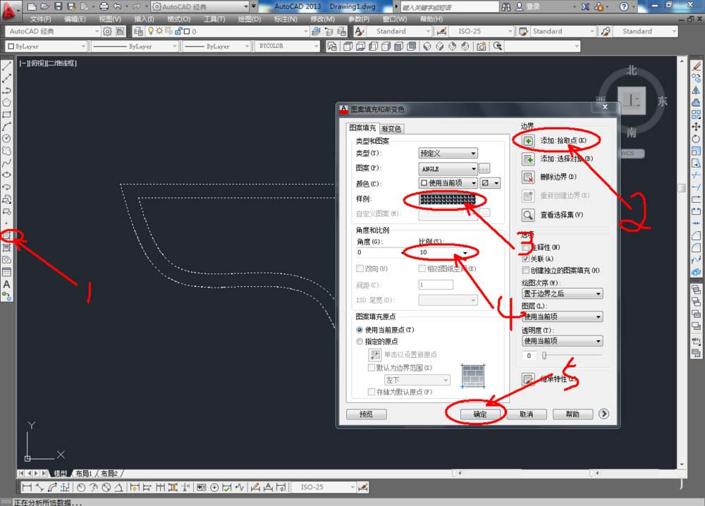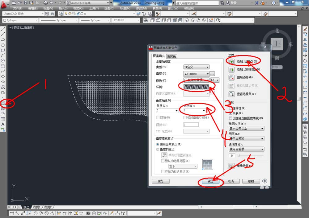 4、点击【填充】工具,弹出填充对话框,点击【添加拾取点】,选择想要填充的区域后,按下空格键回到对话框,按图示操作完成对选区的填充设置后,点击【确定】;