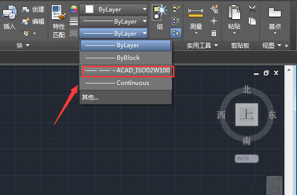 8、点击修剪选项我们将多余的线就行修剪,然后选择圆弧再在线型里找到虚线选项,如图所示: