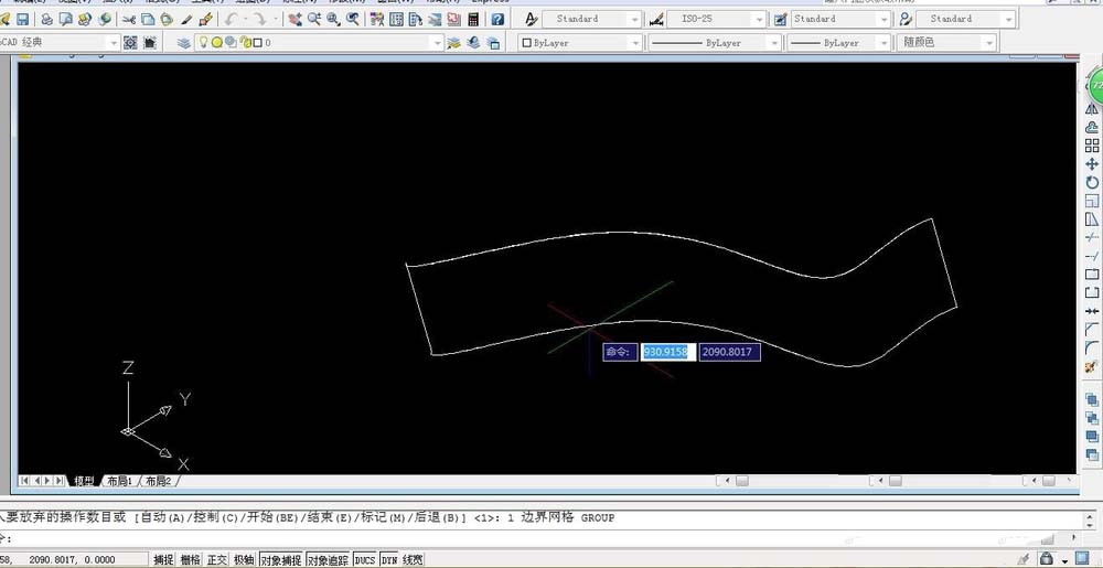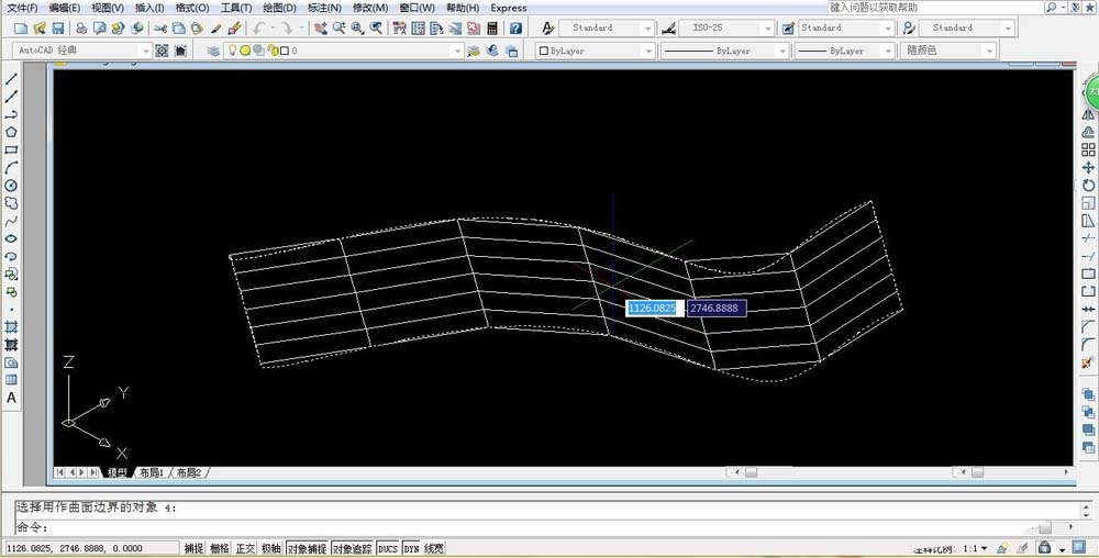 7、绘制边界网格: 选择“绘图”|“建模”|“网格”|“边界网格”命令(EDGESURF),可以使用4条首尾连接的边创建三维多边形网格。这时可在命令行的“选择用作曲面边界的对象 1:”提示信息下选择第一条曲线,在命令行的“选择用作曲面边界的对象 2:”提示信息下选择第二条曲线,在命令行的“选择用作曲面边界的对象 3:”提示信息下选择第三条曲线,在命令行的“选择用作曲面边界的对象4:”提示信息下选择第四条曲线