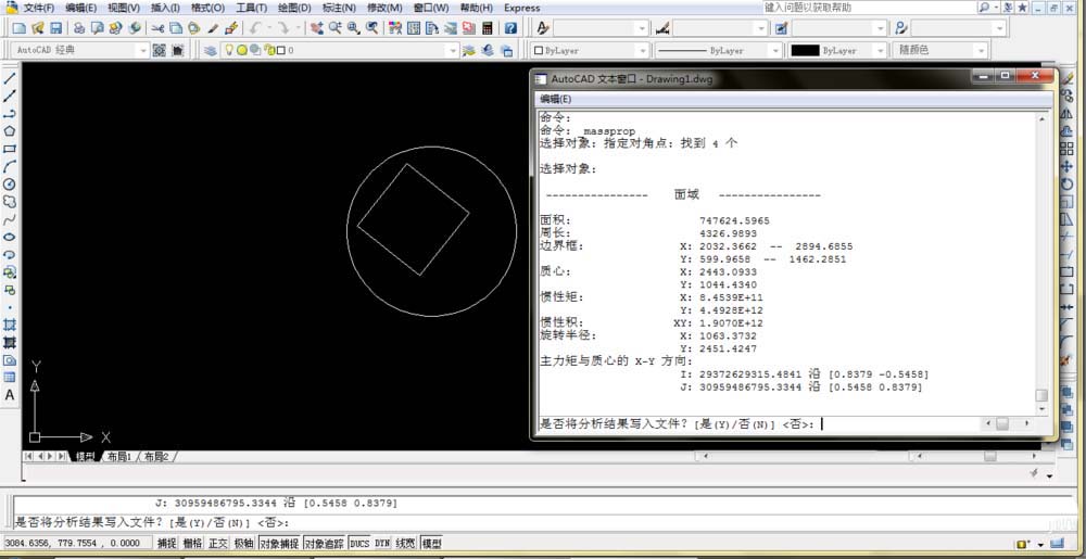 在AutoCAD 2008中,选择“工具”|“查询”|“面域/质量特性”命令(MASSPROP),并选择要提取数据的面域对象,然后按下Enter键,系统将自动切换到“AutoCAD文本窗口”,并显示选择的面域对象的数据特性。