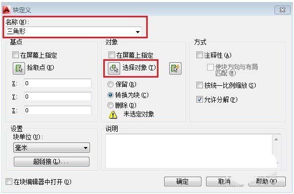 命令行:BLOCK或B,弹出【块定义】对话框,,输入块名称为【三角形】,然后点击【选择】对象,选择刚才绘制的三角形图层,如下图所示: