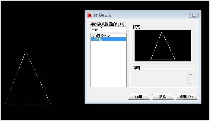 “三角形”块创建完成,此“三角形”块内的线条对象颜色的改变是随块改变的;双击“三角形”块,打开【编辑块定义】