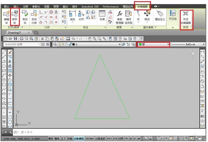 点击【确定】,打开【块编辑器】,设置“三角形”块对象的线的颜色为绿色,点击“保存块”,然后【关闭块编辑器】,如下图所示: