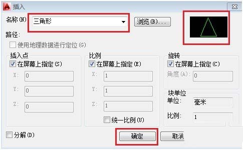 命令行:INSERT或I,弹出块【插入】选项板,选择【三角形】块,然后点击【确定】按钮
