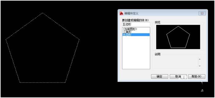 “五边形”块创建完成,此“五边形”块内的线条对象颜色的改变是随层改变的;双击“五边形”块,打开【编辑块定义】
