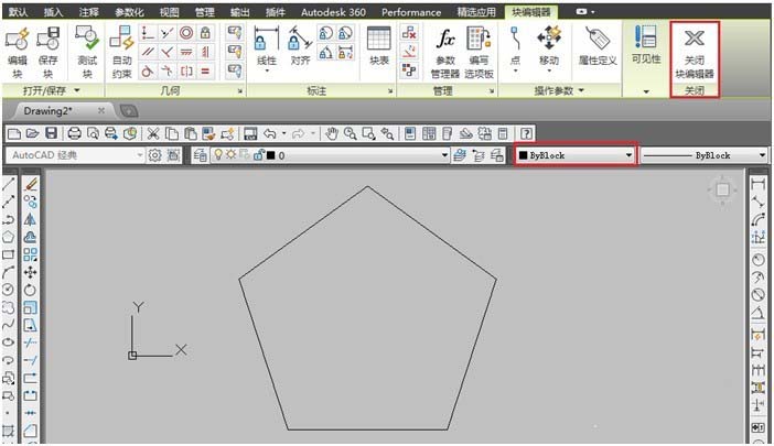 点击【确定】,打开【块编辑器】,发现“五边形”块对象的线的颜色已经设为ByLayer,【关闭块编辑器】,如下图所示: