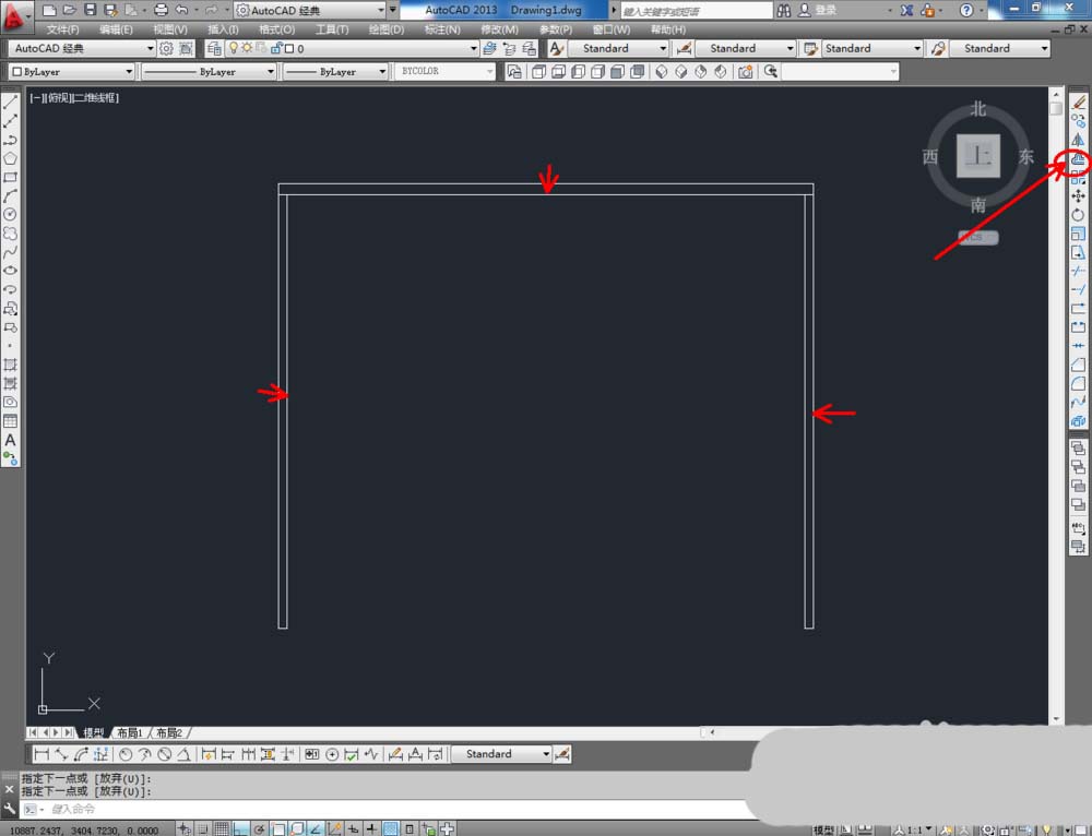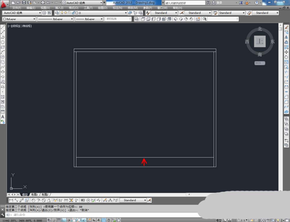 1、打开AutoCAD2013软件,点击【直线工具】,在作图区域绘制出1200mm和1000mm两条线段。点击右边工具栏中的【偏移】命令,分别对各个边进行偏移操作(柜顶板偏移:25)。完成后,点击【直线工具】完成对鞋柜的柜体划分(如图所示);