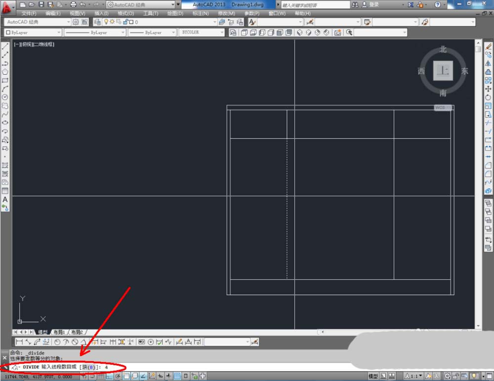 2、接着,开始制作鞋柜隔板(隔板厚度为18mm)。选中图中线段,点击【绘图】-【点】-【定数等分】,输入等分值:4,后,敲击【空格键】。完成后,点击【直线工具】结合【偏移】命令画出隔板并复制出余下隔板(如图所示);