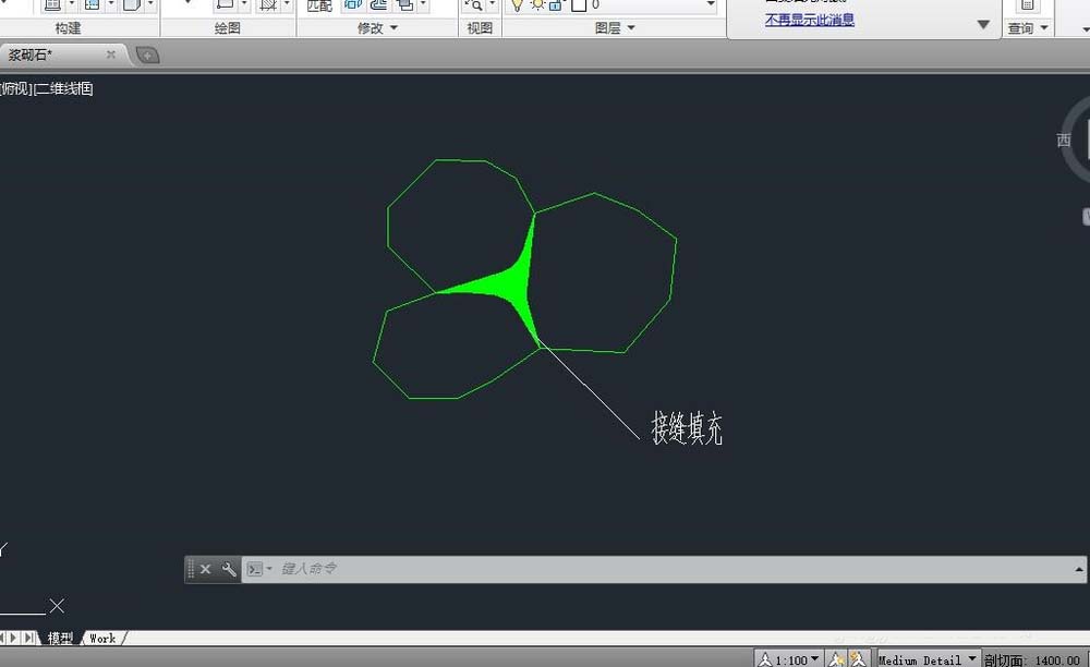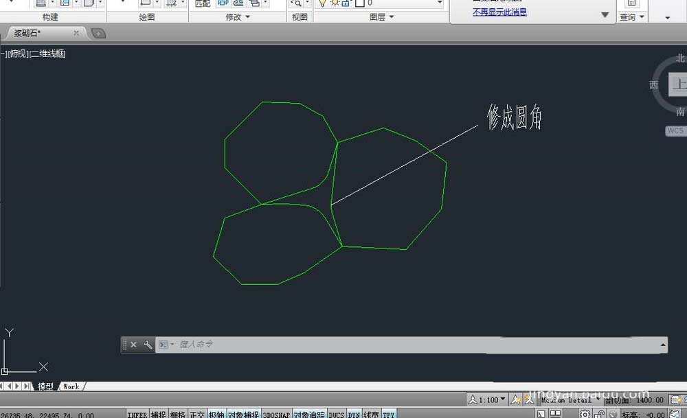 3、然后将要填充部分的几个角利用圆角命令(fillet-r)修成圆弧状,(因为水泥勾缝一般都是圆弧状,而不是生硬的角状)