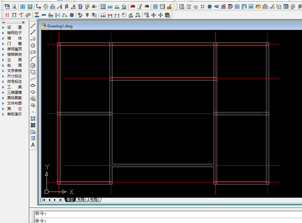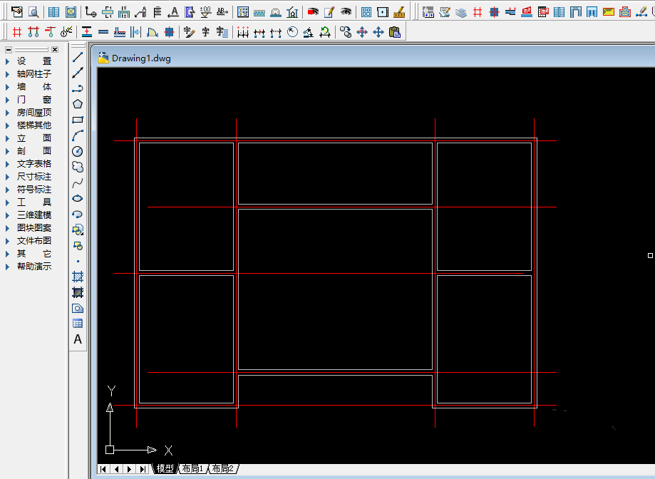 2、在轴网上绘制墙体,墙体绘制完成后,如下图所示