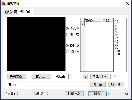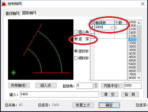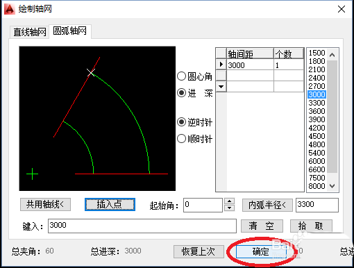 4、打开“圆弧轴网”编辑页面,依次选择自己需要的“圆心角”、“轴夹角”、“个数”;“进深”、“轴间距”、“个数”;然后点击确定,插入圆弧轴网,如下图所示