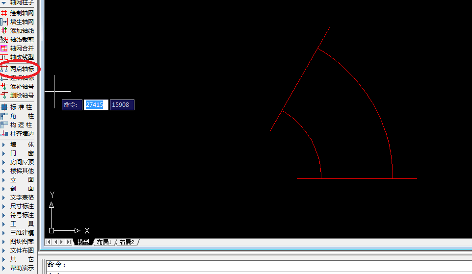 5、点击二次目录“两点轴标”,打开“轴网标注”编辑页面,选择“单侧标注”,然后根据命令行提示进行轴网标准,如下图所示