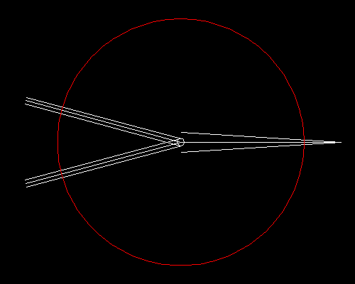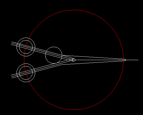 2、头部78mm尖端处分别旋转3.5°,得到剪刀身体雏形。尾部分别双向偏移1.75mm,得到尾部把手雏形。以轴点为圆心,画辅助圆,与尾部交点得到把手环的圆心。