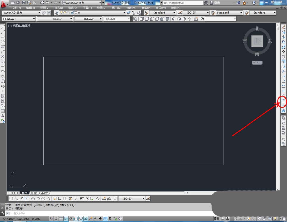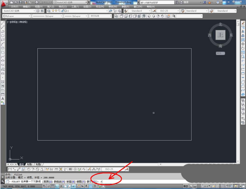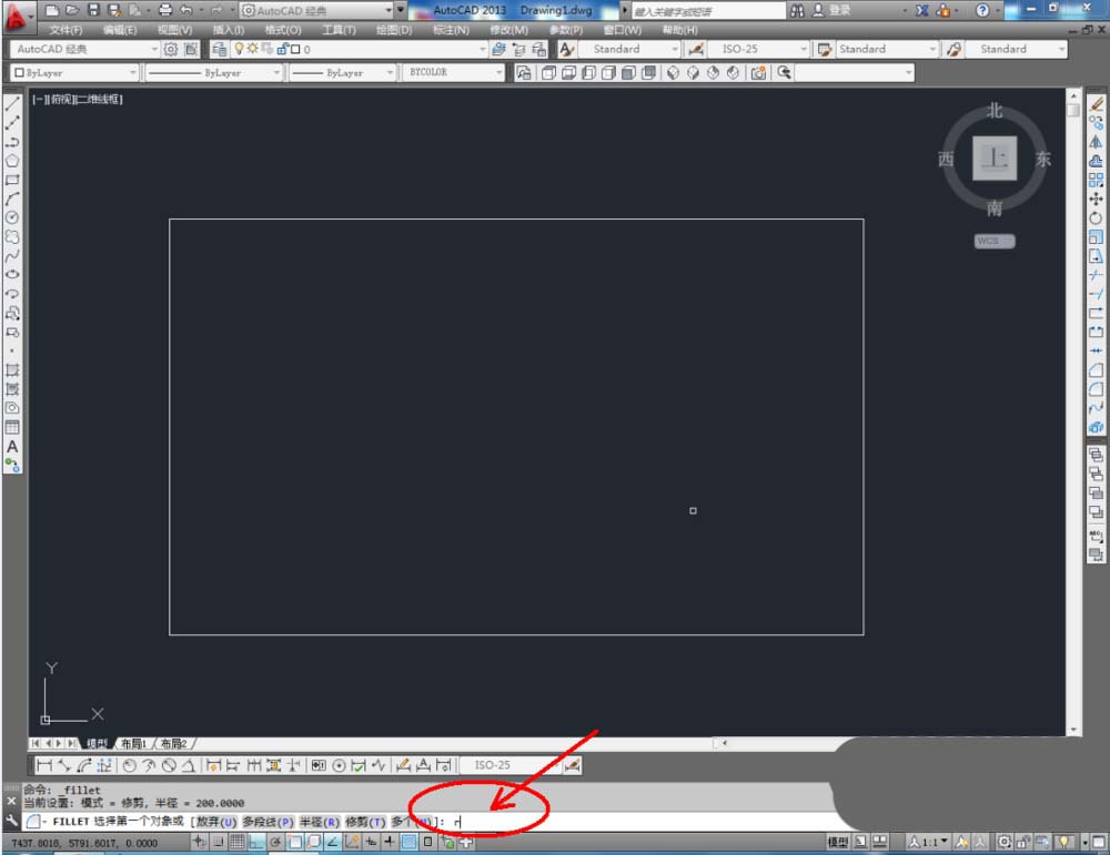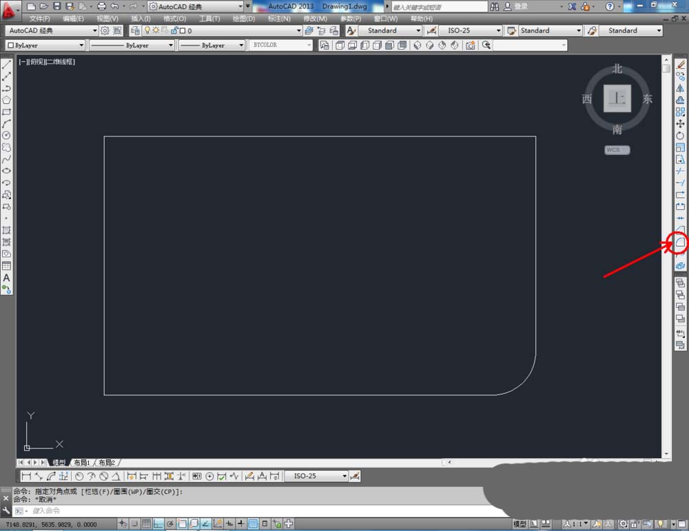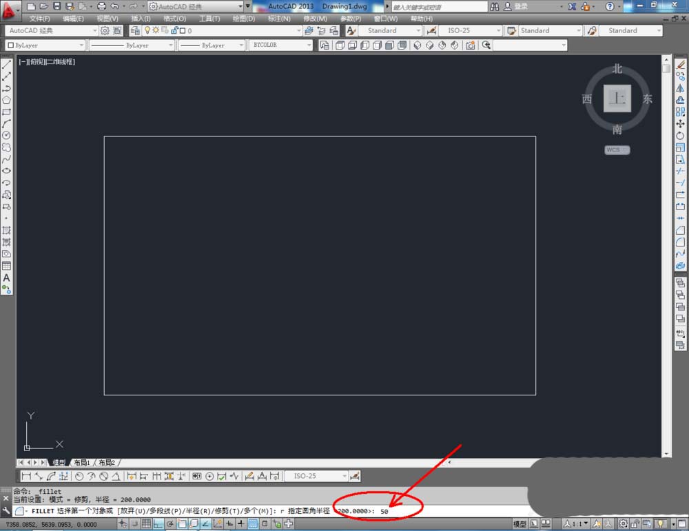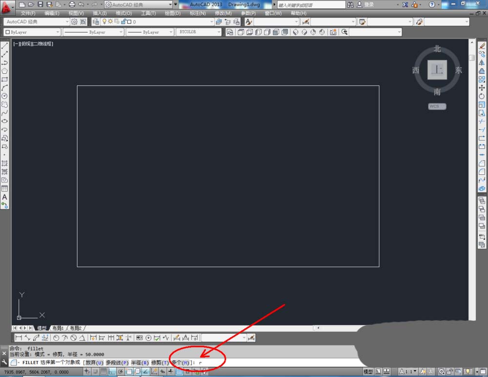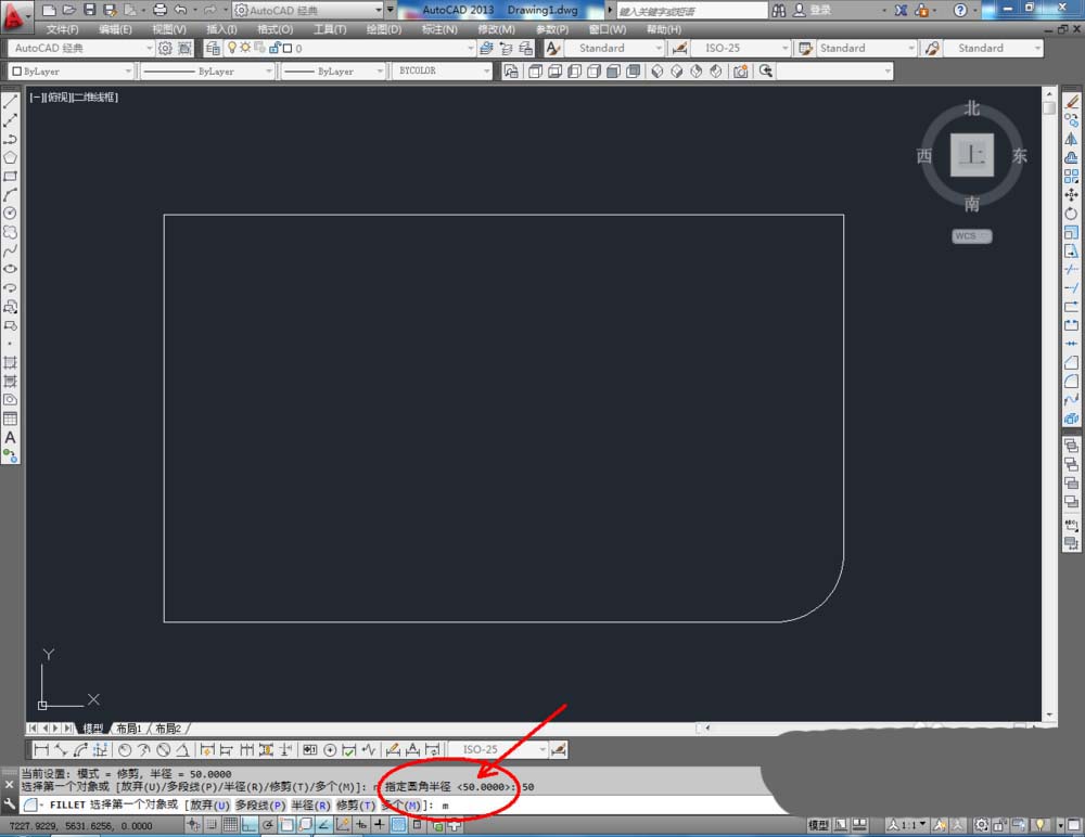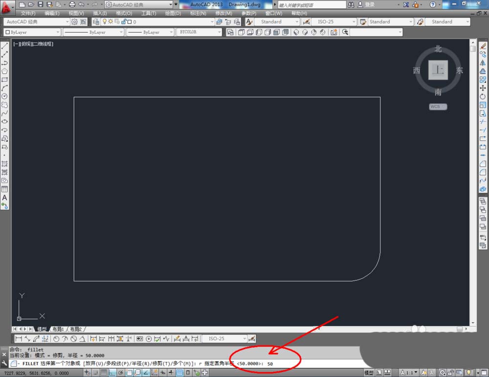 2、点击右边工作区中的【圆角】,在下方命令栏中输入:r,按下空格键。继续输入:50,按下空格键。完成后,鼠标点击需要进行圆角的角的两条边(如图所示);