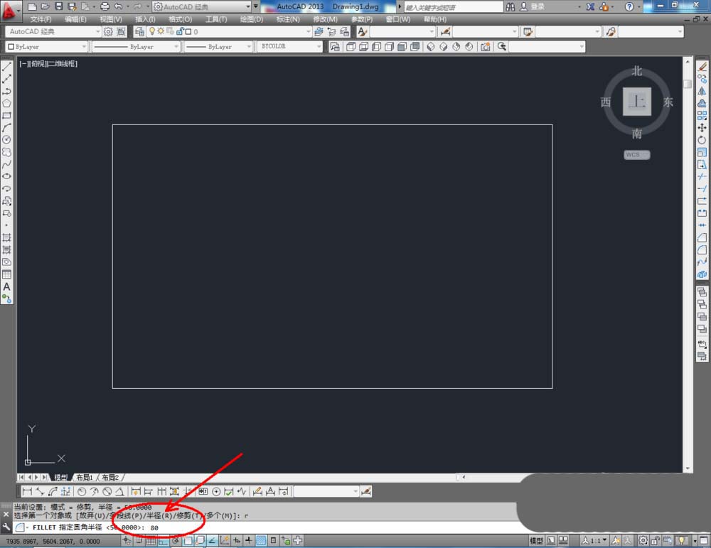 5、点击右边工作区中的【圆角】,在下方命令栏中输入:r,按下空格键。继续输入:80,按下空格键。完成后,鼠标点击需要进行圆角的角的两条边(如图所示);