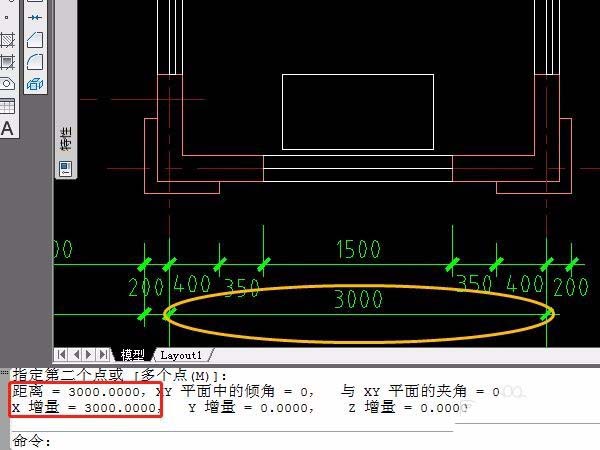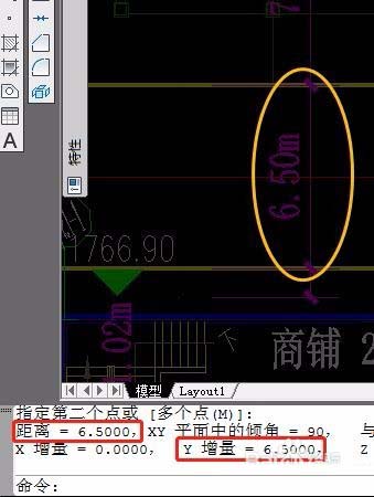 2、输入键盘“di”测量工具,实测图形的实际大小:门岗平面图中标注“3000”(mm)的距离为“3000”(图形单位);小区总平图中标注“6.5m”的距离为“6.5”(图形单位);