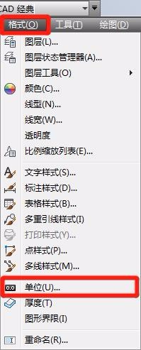 1、在“格式”下拉菜单中找到“图形单位”设置窗口。