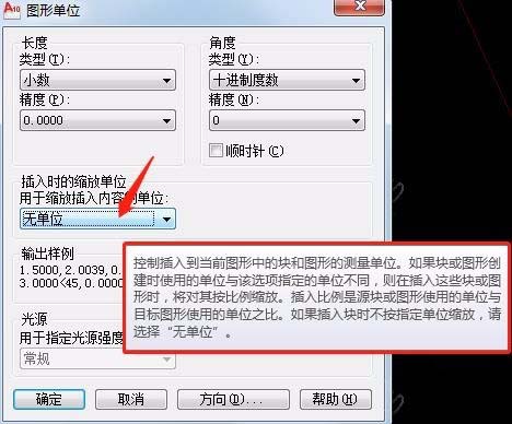 当鼠标悬停在“插入时的缩放单位”的下拉选项上时,系统自动显示该选项的释义:“控制插入到当前图形的块和图形的测量单位。如果块或图形创建时使用的单位与该选项指定的单位不同,则在插入这些块或图形时,将对其按比例缩放。插入比例是源块或图形使用的单位与目标图形使用的单位之比。如果插入块时不按指定单位缩放,请选择“无单位”。”