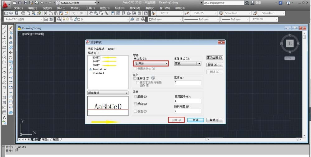 2、字体的样式和大小的修改,我们在作图的时候通常用的事宋体,能用到的字体大小一般是200、140、120的,按住快捷键st进行修改,如图所示。
