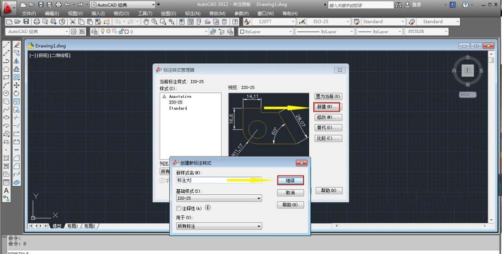 4、标注样式的设置,点击标注里面的标注样式。点击新建分别设置大、中、小三个标注,点击继续,如图所示。