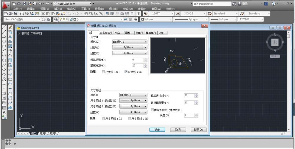 5、点击继续之后,再点击线的尺寸线和延伸线的设置,我们通常用到的数据如下面图纸所示,设置好之后点击确定。