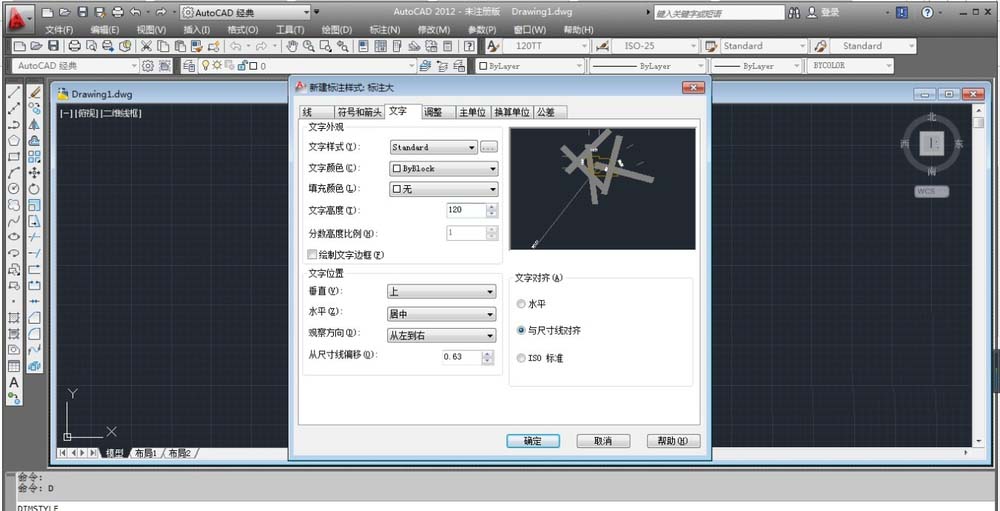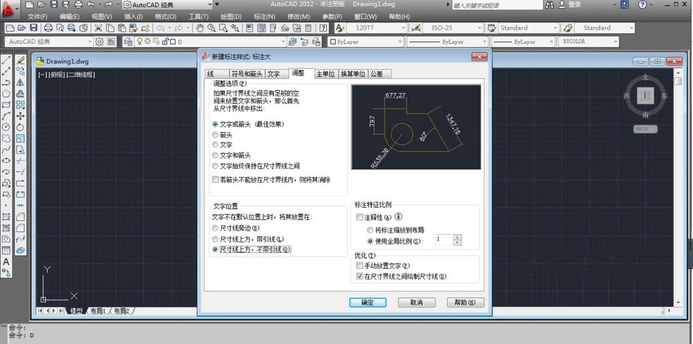 7、文字的大小大标注使用的是120、中标注字的大小100。调整方面选择尺寸线的上方,不带引线,如下图所示。