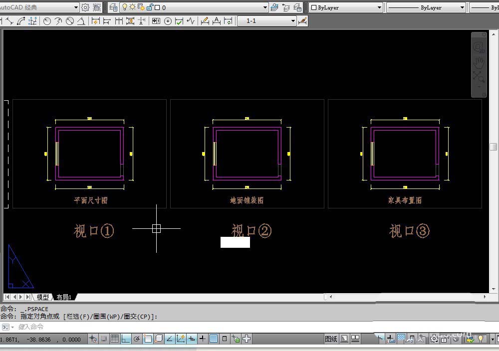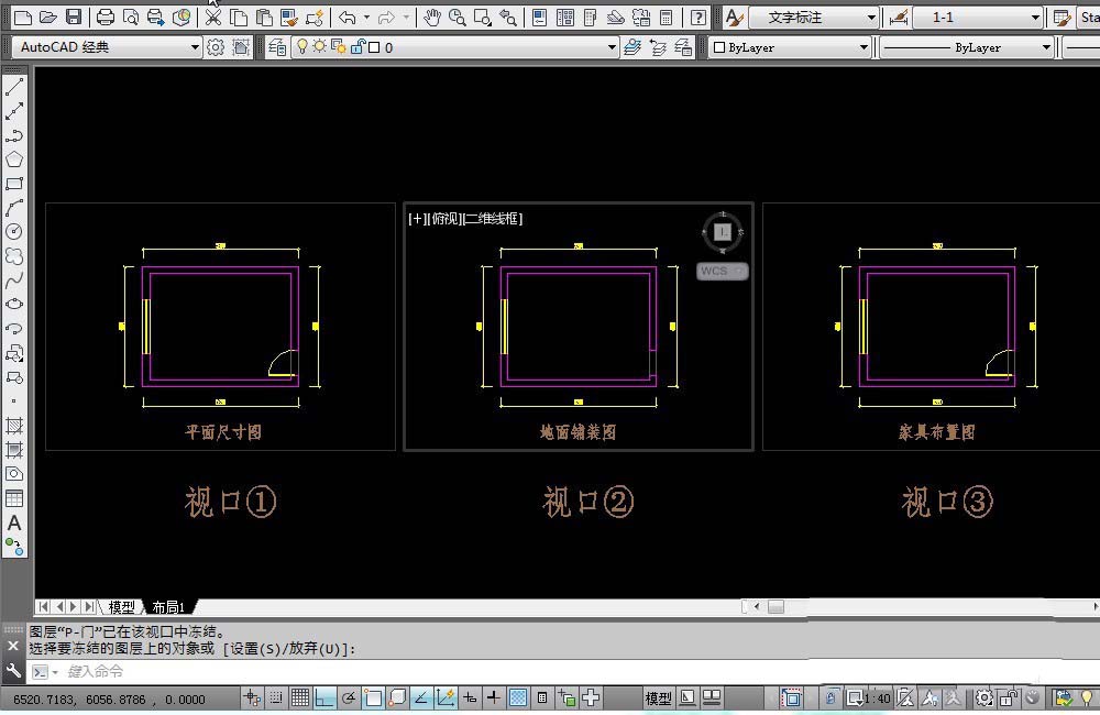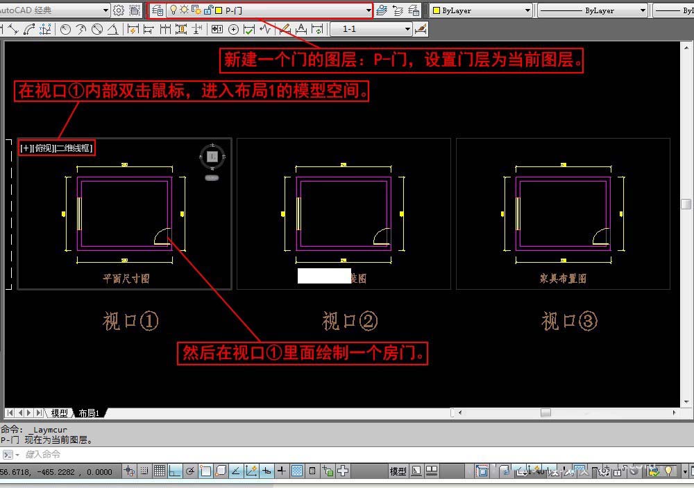 1、如图所示布局1有3个视口。在视口①内部双击鼠标,进入布局1的模型空间。新建一个门的图层:P-门,设置门层为当前图层。然后在视口①里面绘制一个房门。在视口②,视口③中当然也会看到这个门。