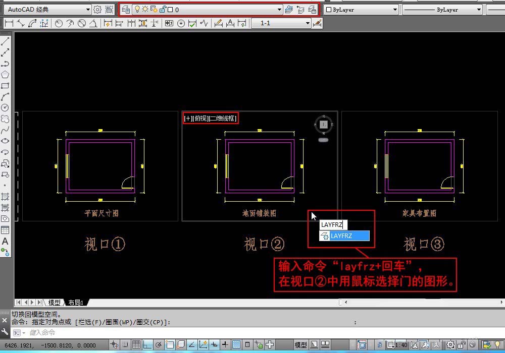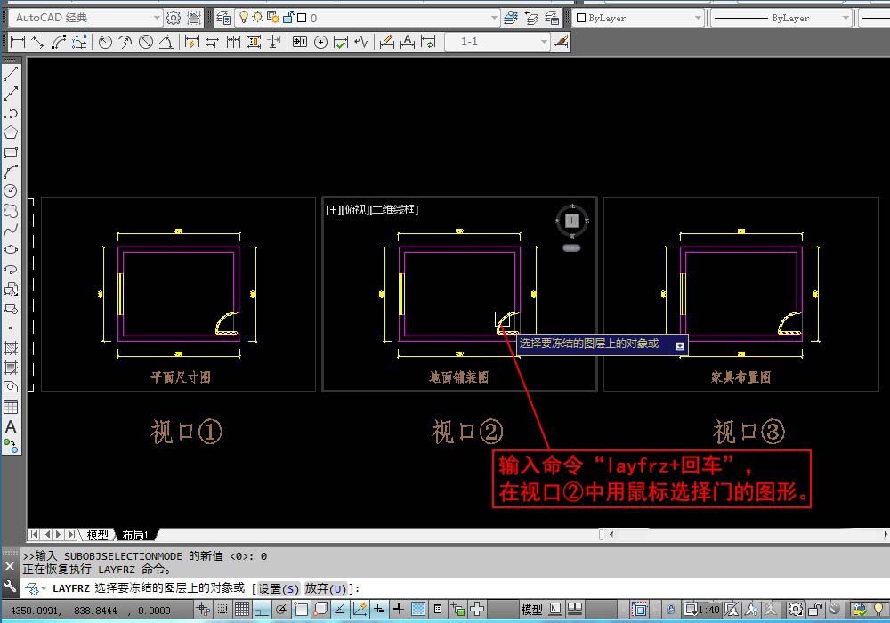 2、现在我们需要在视口②冻结门图层。输入命令“layfrz+回车”,在视口②中用鼠标单击门的图形。就可以在视口②冻结门图层。“layfrz+回车”就是在当在当前视口冻结选择对象所在的图层。