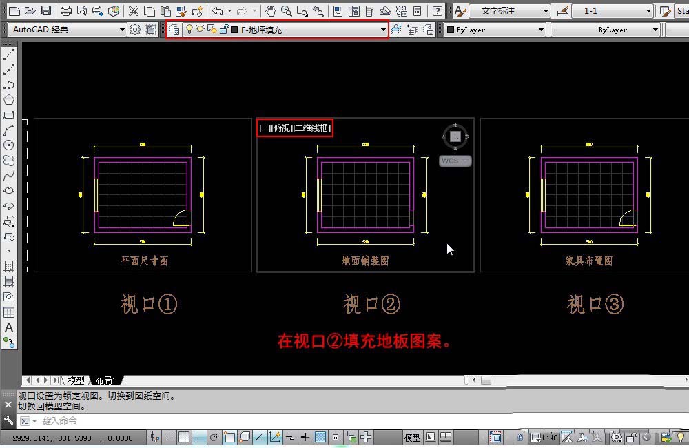 3、建立一个新图层:F-地坪填充,设置为当前图层。在视口②填充地板图案。当然在视口①和视口③也会看到填充的图案。