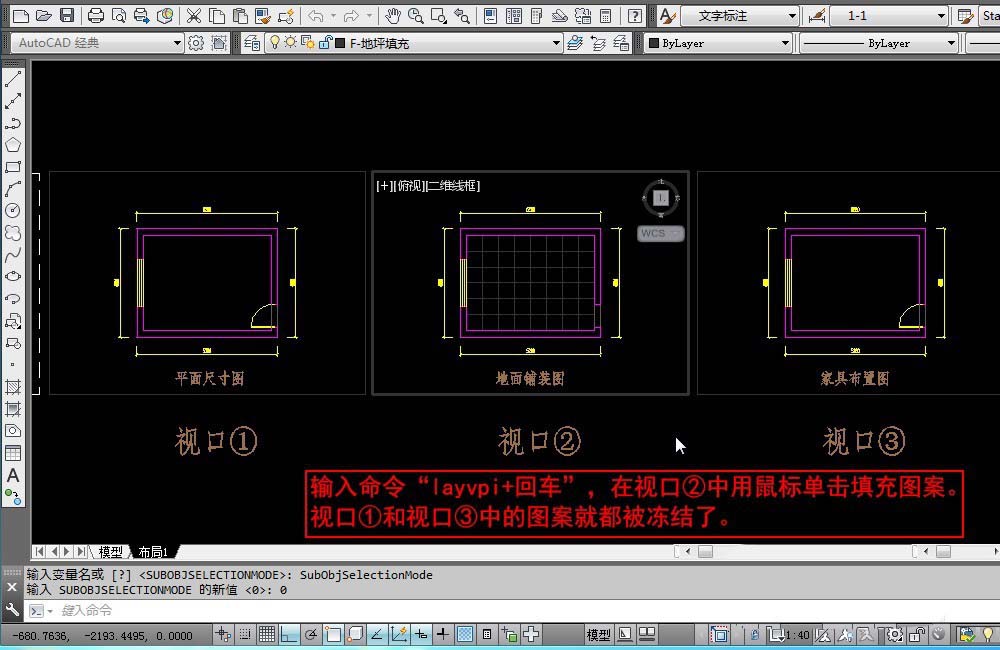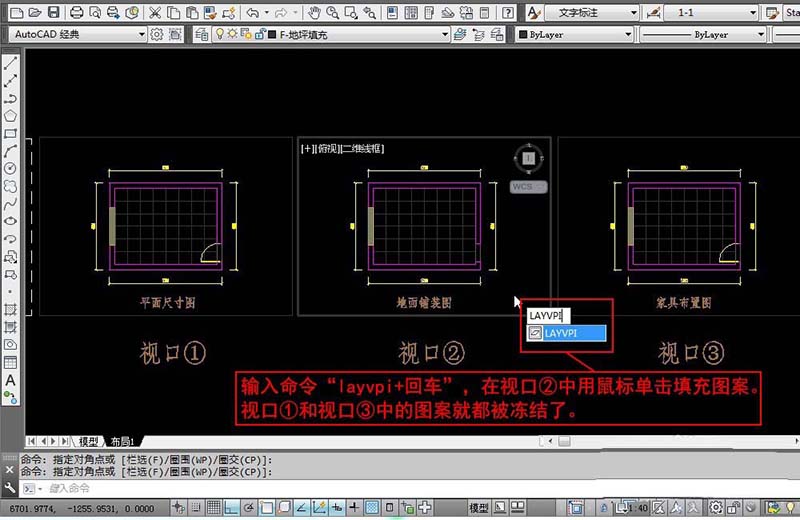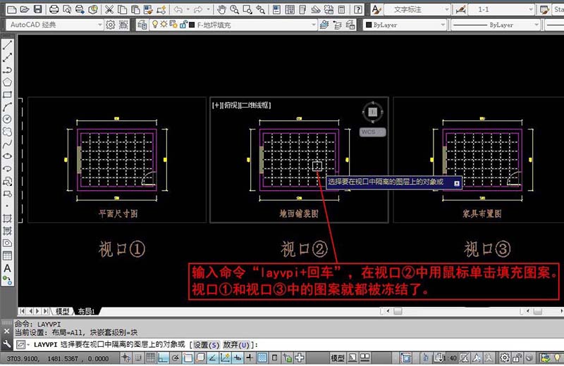 4、现在我们需要在视口②之外的其它视口冻结填充图层。输入命令“layvpi+回车”,在视口②中用鼠标单击填充图案。视口①和视口③中的图案就都被冻结了。“layvpi+回车”就是在当前视口之外的其它所有视口冻结当前选择对象所在的图层。