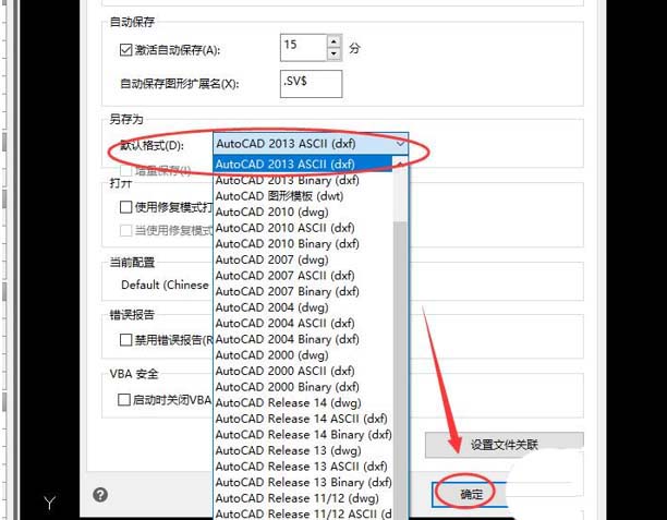 4、最后,在“默认格式”中将默认格式设置为dxf格式就可以了。