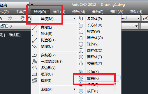14、如下图所示,执行【绘图——建模——旋转】,激活旋转命令。