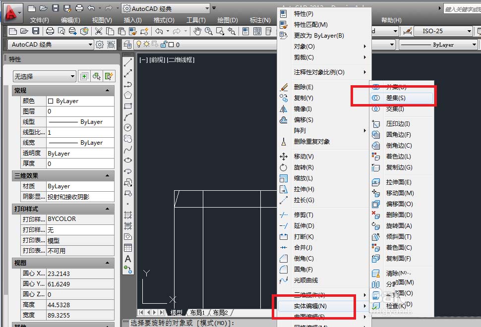 16、如下图所示,执行【修改——实体编辑——差集】,激活“差集”命令。