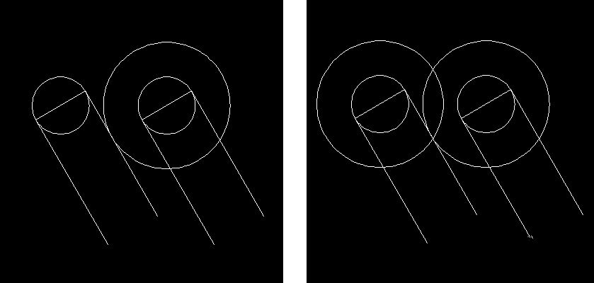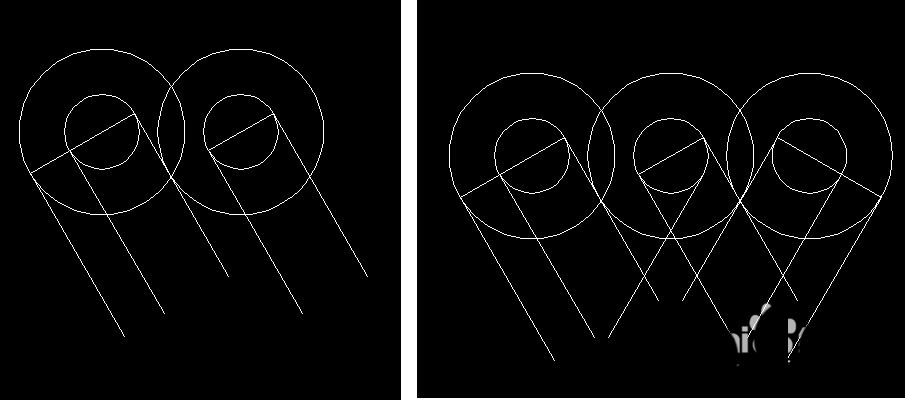 3、以右边圆心为原点,作大圆与左边圆切线相切。再将大圆复制到左边小圆圆心位置,作出两个同心圆环。