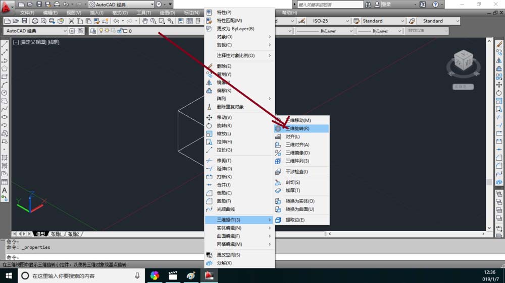 4、然后又打开三维操作的选项菜单选项中点击三维旋转命令。