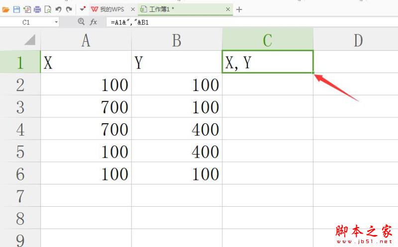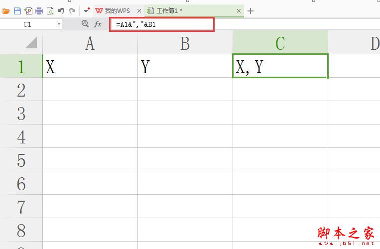 2. 我们再A1输入X,B1输入Y,在C1输入公式=A1&","&B1,这个时候在C1就会自动出现X,Y了