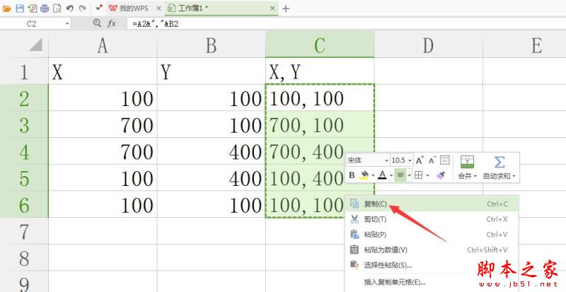 4. 双击这个“+”号,下面会根据公式自动将XY轴坐标合并在一起,然后选择所有生成的坐标,复制坐标