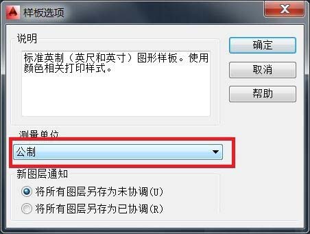 6、这时会弹出一个菜单---选择模板的单位---确定--然后关闭文件