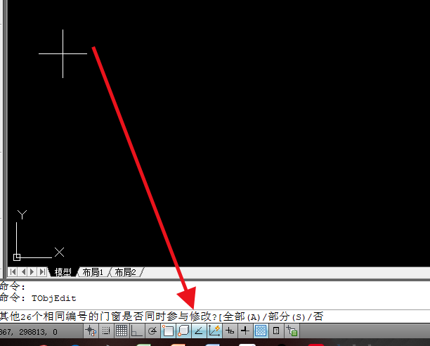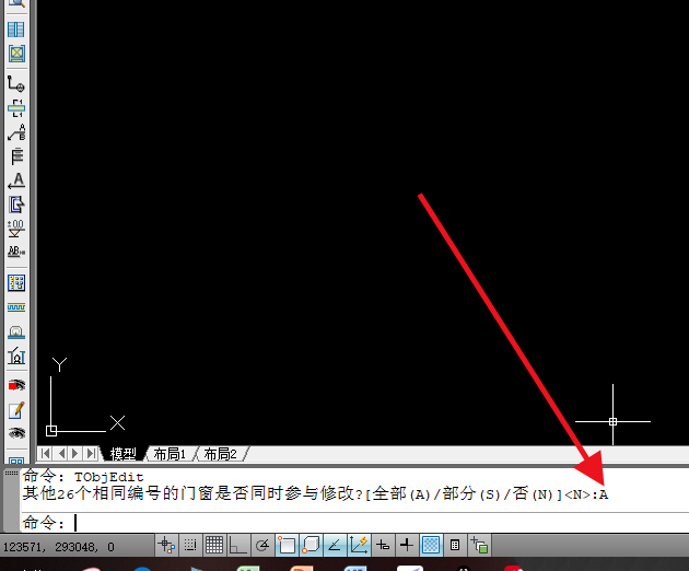 5、这时我们可以看到下方提示中,改图纸中有26个尺寸同型号窗户,我们输入字母“A”,选择全部修改