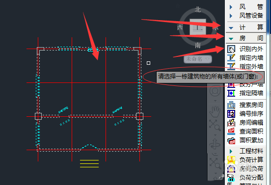 首先,点击图示位置工具导航栏中的:计算--房间--识别内外,然后将你的建筑进行框选,然后点击鼠标空格键,识别内外墙体,外墙外围将包围一层虚线。