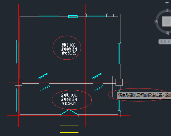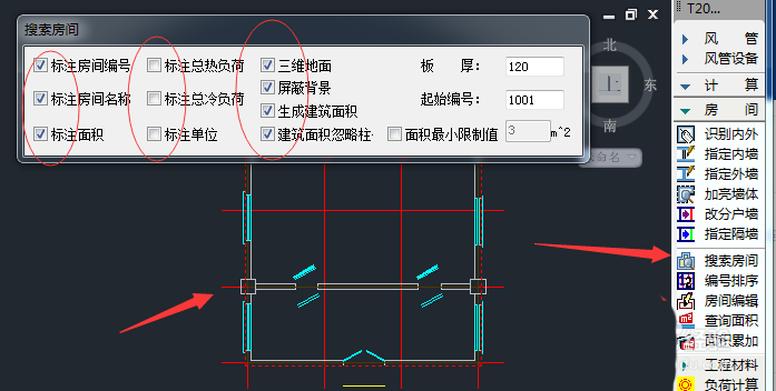 然后点击图示位置中的“搜索房间”命令,然后在弹出的对话窗口中,点击选择你要勾选的内容,然后在图中同样框选中你的建筑,然后点击空格,系统会自动为你的建筑房间进行排序,标注房间号等。