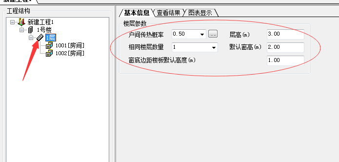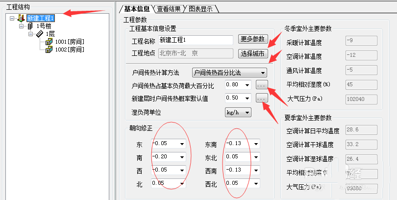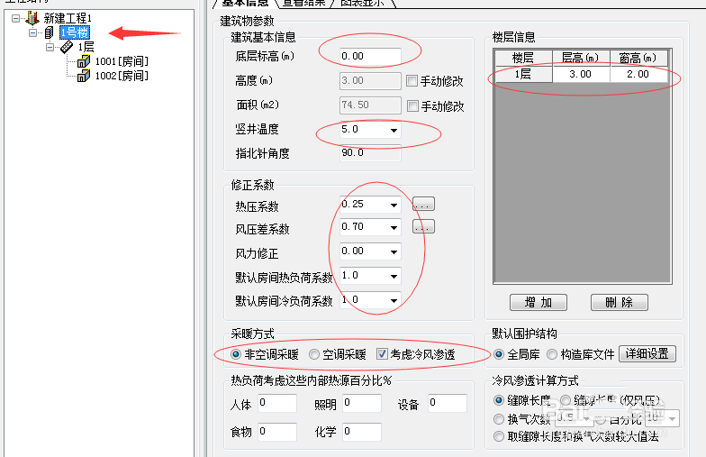 然后在负荷计算工程对话框中,点击图示位置中的“新建工程”、“一号楼”、“一层”等,对建筑的信息进行基本的设定,要满足实际工况。