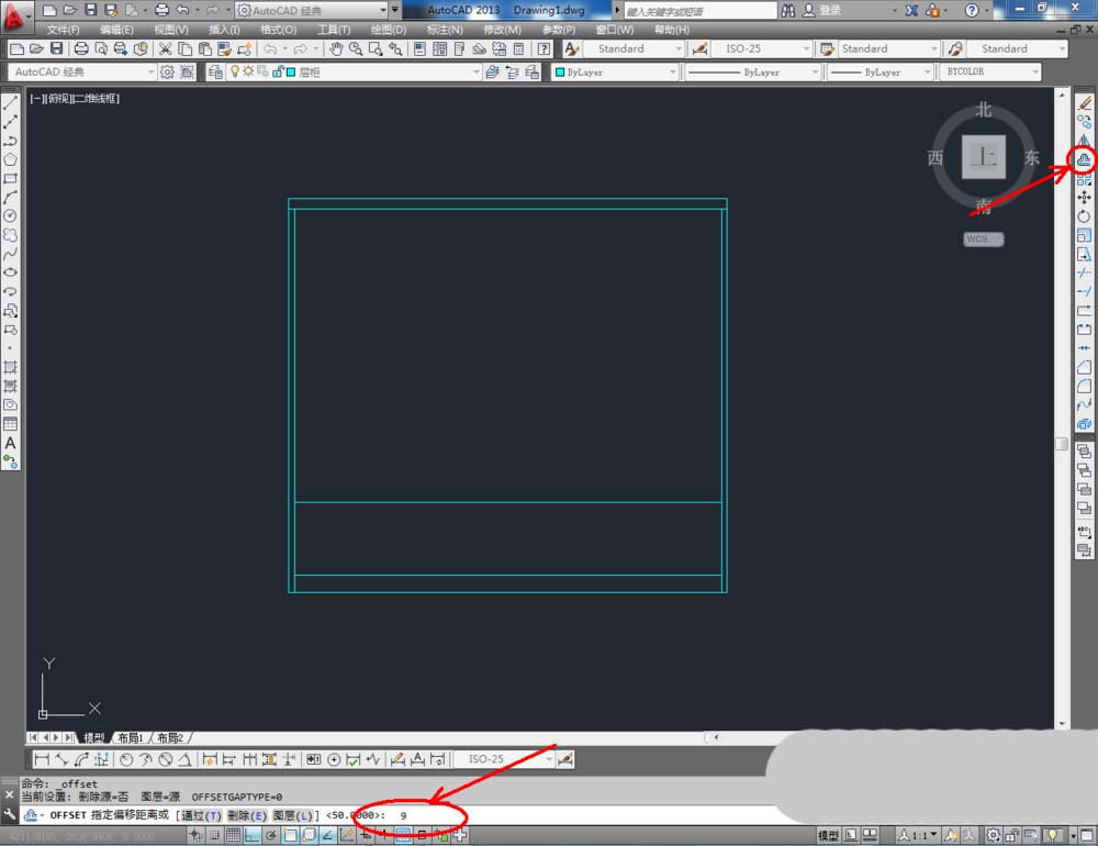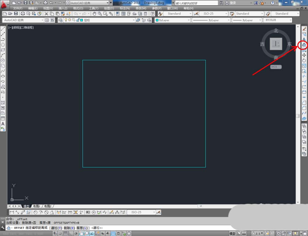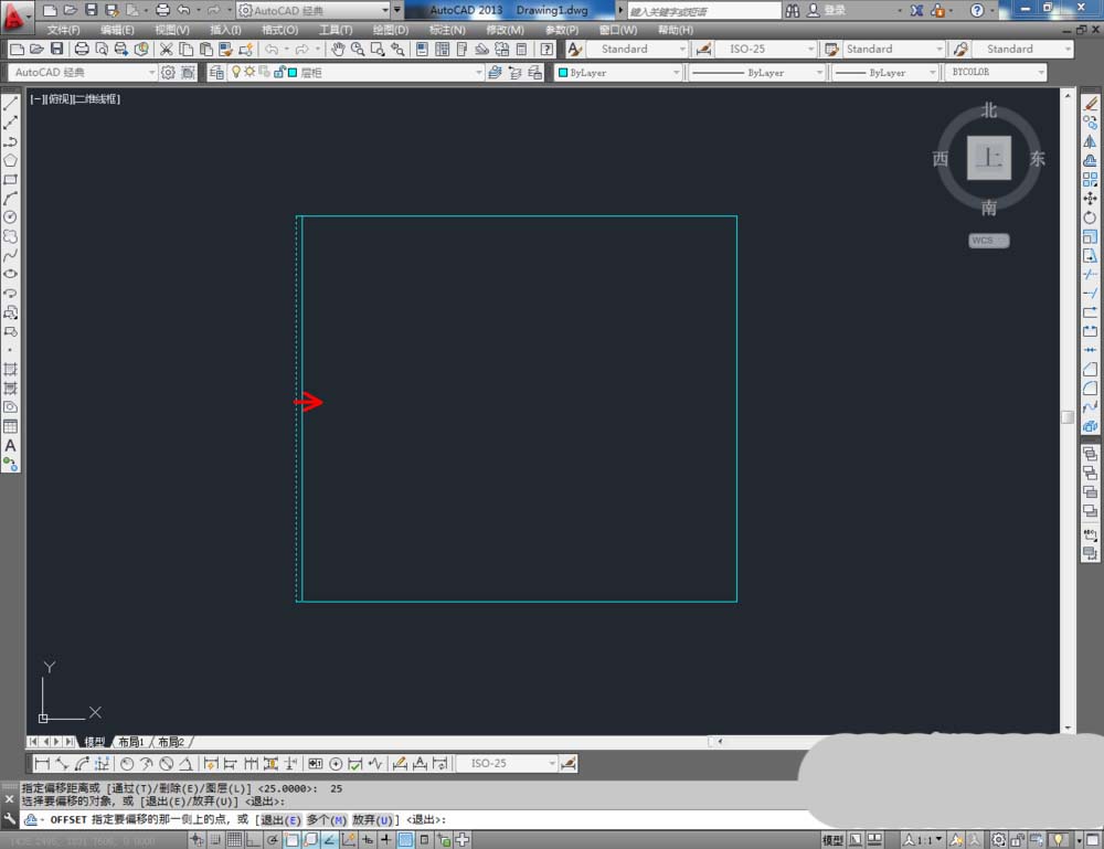 3、点击右边工具栏中的【偏移工具】,在命令栏输入数值:25后,对侧边进行向内偏移。继续点击【偏移工具】,在命令栏输入偏移数值:80后,对图案底边进行向上偏移;输入数值:50,对图案顶边进行向上偏移,并调整好左右两条侧边上的端点(如图所示);