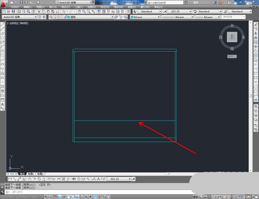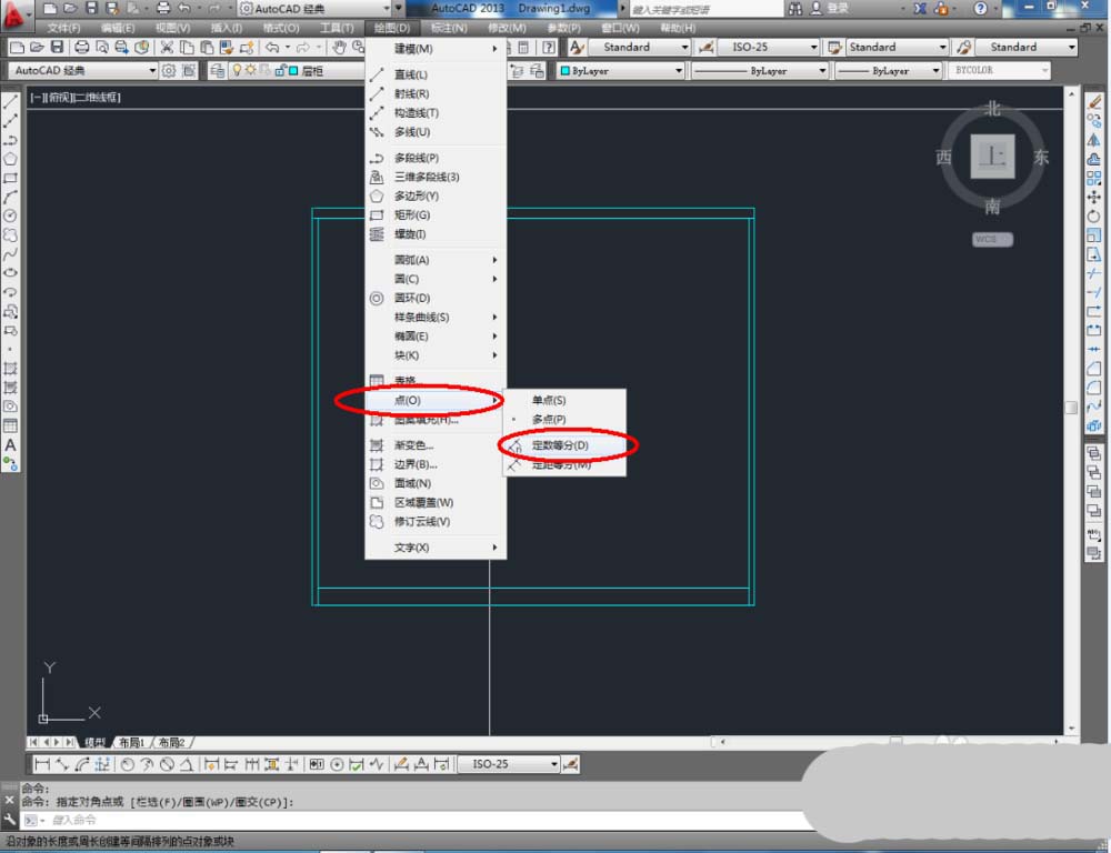 6、点击【绘图】-【点】-【定数等分】,将图示选线分为四等分和五等分。最后,按图示完成中隔板部分图案的绘制,这样我们的层柜平面图就全部制作完成了。