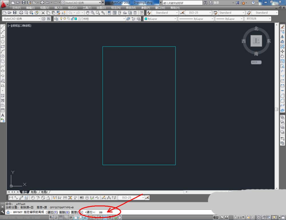 5、点击【矩形工具】,按图示绘制两个矩形图案后,点击【偏移】,在命令栏中输入偏移数值:50,对矩形进行偏移操作。完成后,在命令栏输入:co并按下空格键进行移动复制(如图所示);