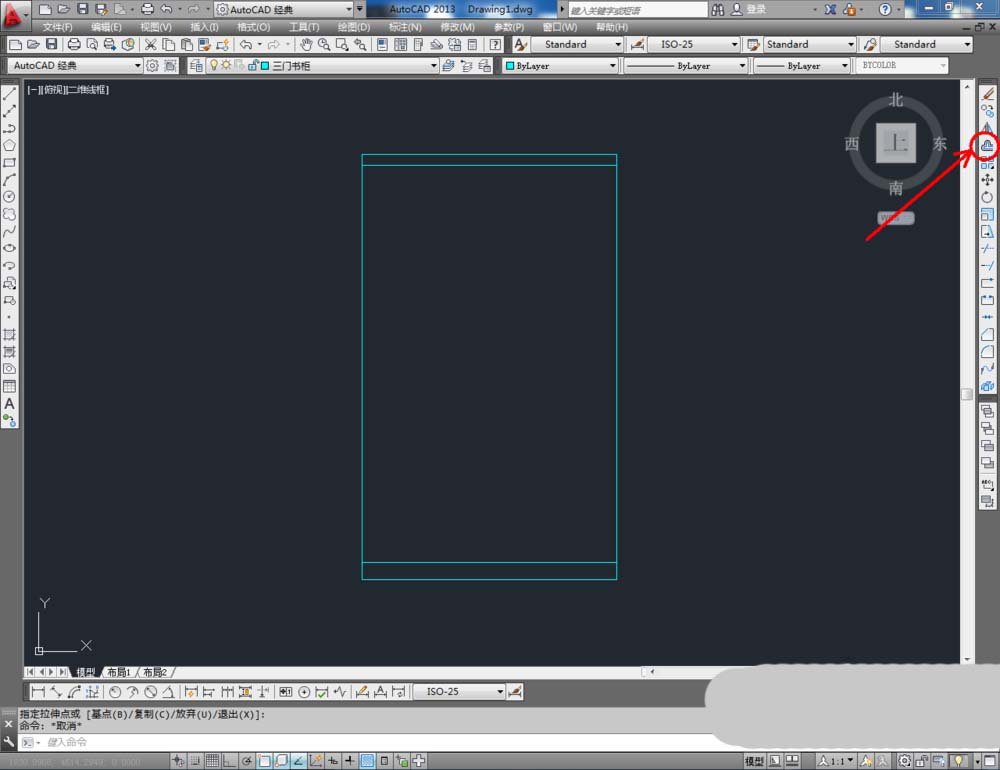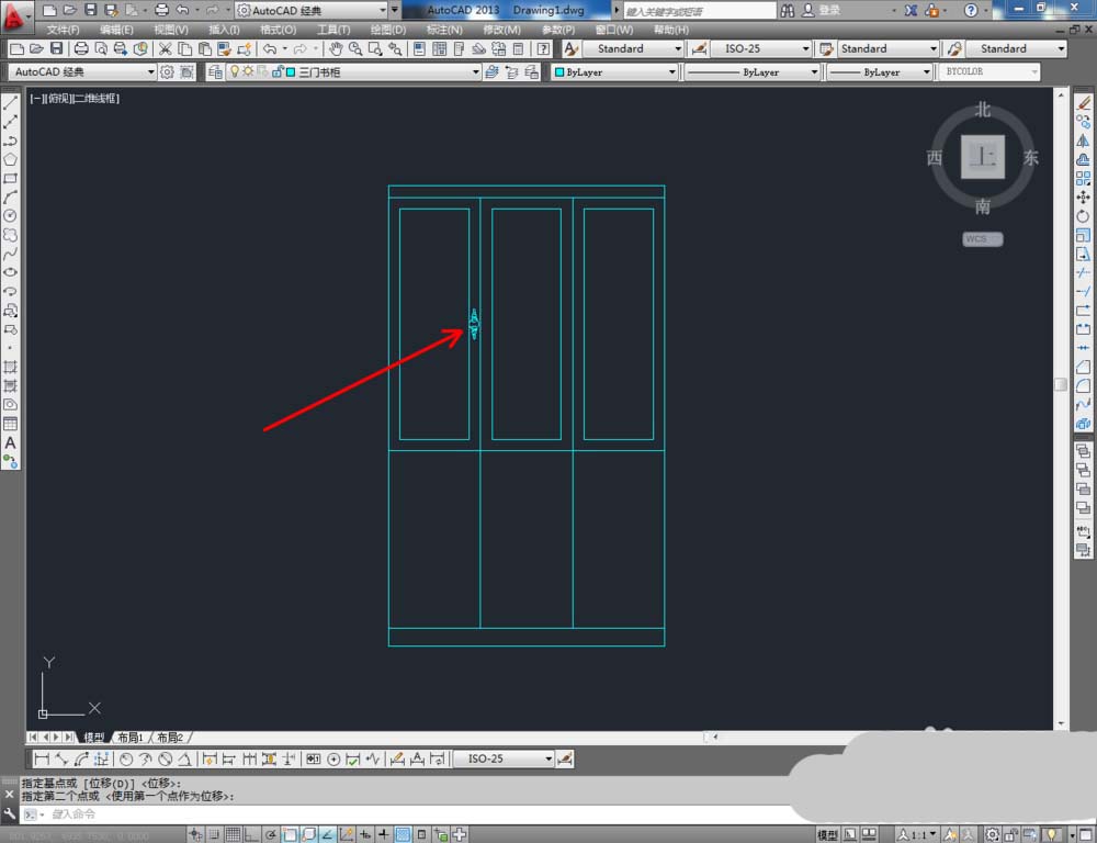 6、最后,将制作好的拉手图块导入文件并调整好拉手的位置。完成细节部分的制作后,我们的三门书柜平面图便全部制作完成。