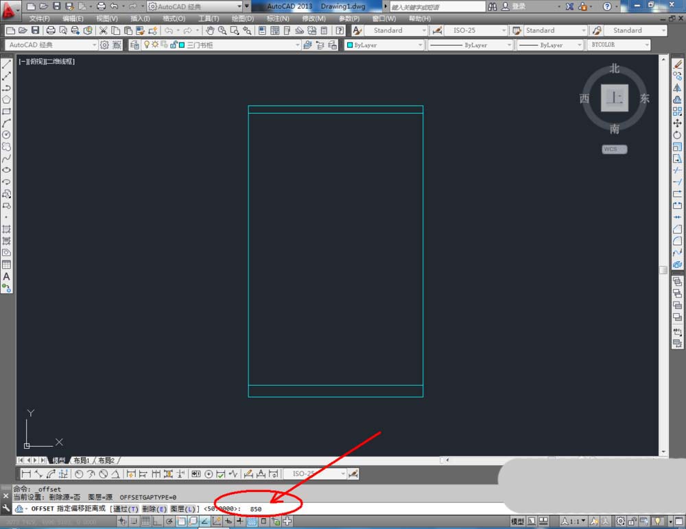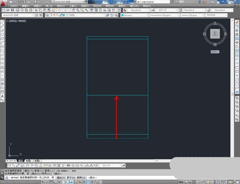 4、点击【偏移工具】,在命令栏输入偏移数值:850后,对底边进行向上偏移。完成后,点击【绘图】-【点】-【定数等分】将选线分为三等分(如图所示);